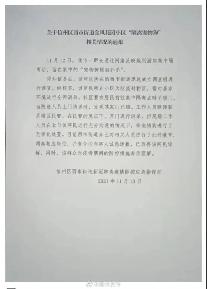 11月13日23时37分,@信州发布发表《关于信州区西市街道金凤花园小区‘隔离宠物狗’相关情况的通报》称:“现场工作人员在未与该网民进行充分沟通的情况下,将宠物狗进行了无害化处置。”