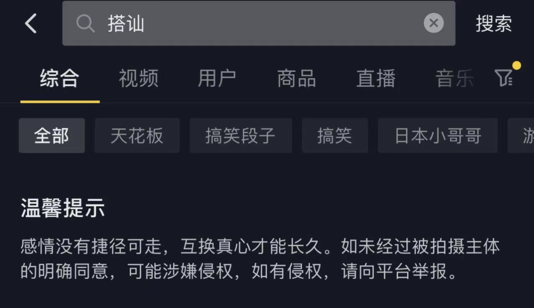 11月21日晚,记者搜索关键词“搭讪”发现,有些短视频平台添加了温馨提示:如未经过被拍摄主体的明确同意,可能涉嫌侵权,如有侵权,请向平台举报。