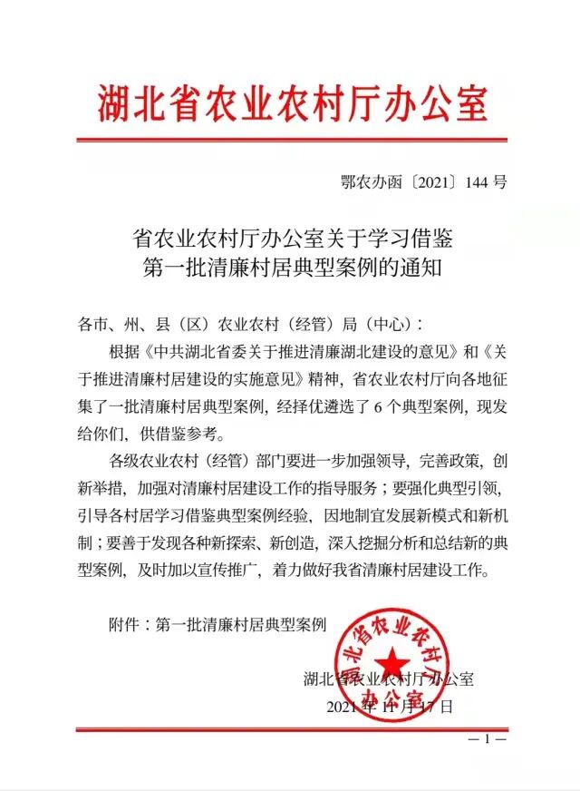 11月17日,省农业农村厅办公室下发关于学习借鉴第一批清廉村居典型案例的通知,择优选取了6个典型案例供各地学习借鉴。其中,麻城市黄土岗镇堰头垸村《党建引领共治理清廉正气暖乡亲》入选。