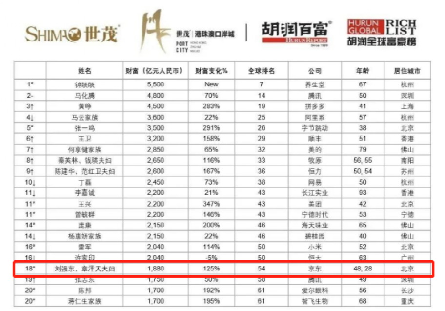 2021年,刘强东、章泽天夫妇以1880亿的财富,位列《胡润全球富豪榜》第54位,中国榜第18位。而章泽天则是中国榜前20 名中,年龄最小的一位。