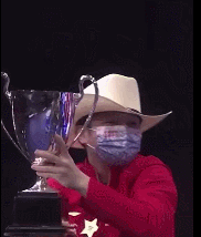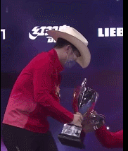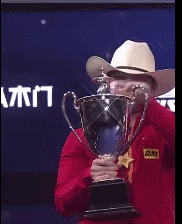 戴着牛仔帽的小胖在捧起奖杯时不慎被滑落的杯盖砸中脑袋