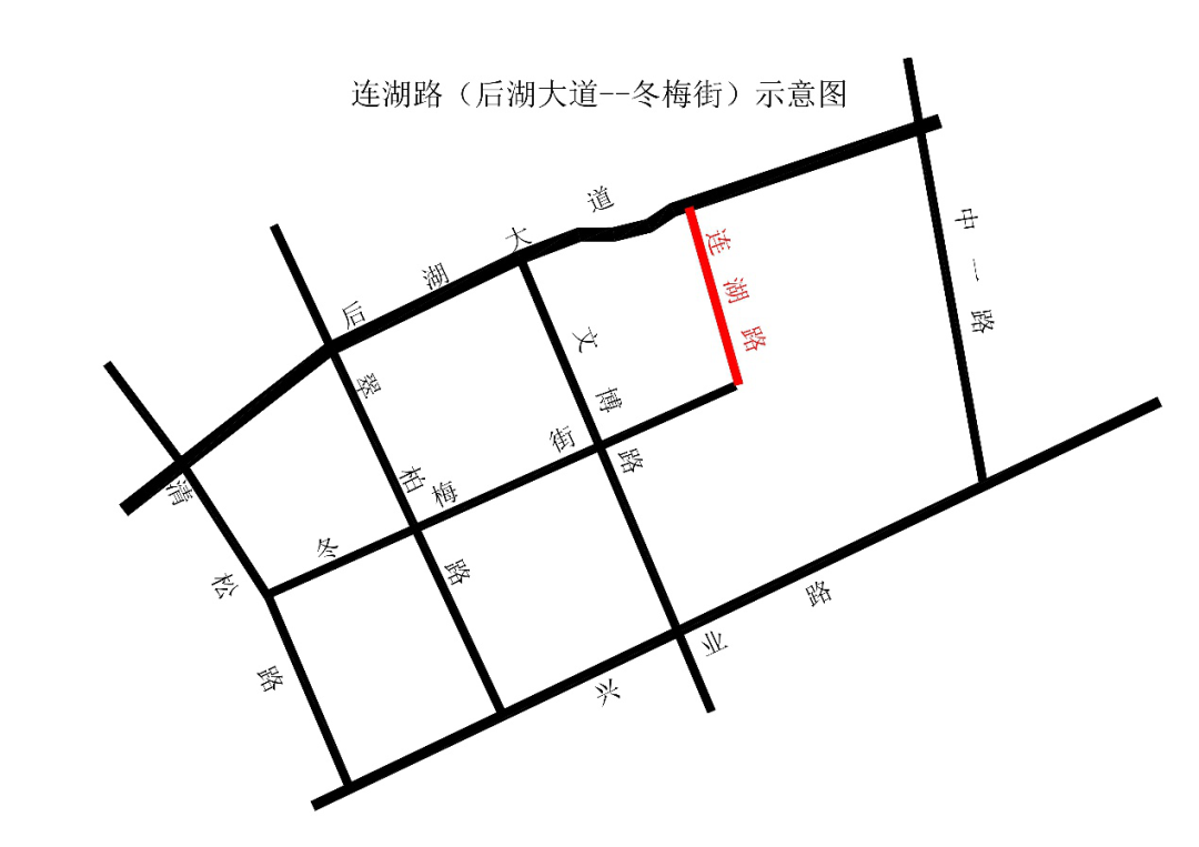 连湖路(后湖大道—冬梅街)段位于后湖片区,北起后湖大道,南至冬梅街,长度为340米。道路红线宽20米,双向2车道,两侧还设有非机动车道和人行道;车行道均为沥青混凝土路面,人行道采用海绵城市标准设计,彩色环保透水砖铺装。