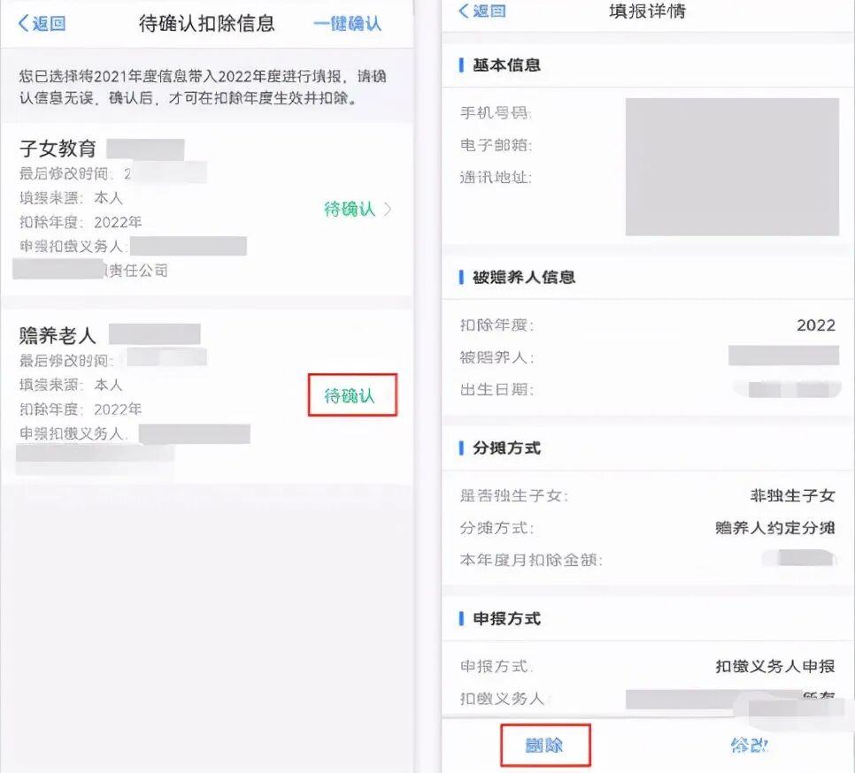 在【待确认扣除信息】点击“赡养老人”【待确认】,点击【删除】。