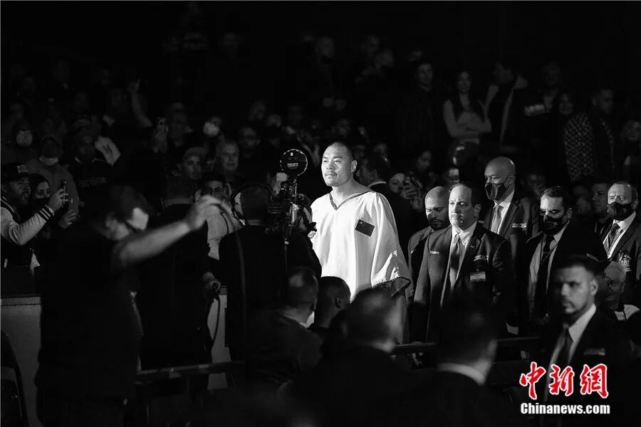2021年11月27日,张志磊出战重量级拳击比赛。这是他首次在被誉为美国职业拳击殿堂的纽约麦迪逊广场花园亮相。中新社记者廖攀 摄