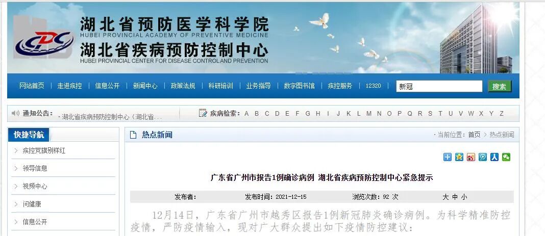 广东省广州市报告1例确诊病例 湖北省疾病预防控制中心紧急提示