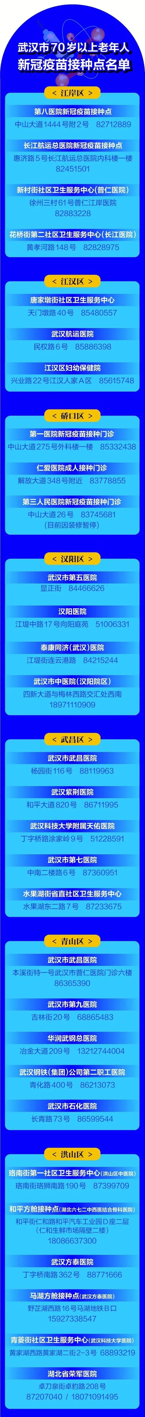 日前,武汉市疫情防控指挥部公布70岁以上老年人新冠疫苗接种定点机构名单,方便老年人预约接种。