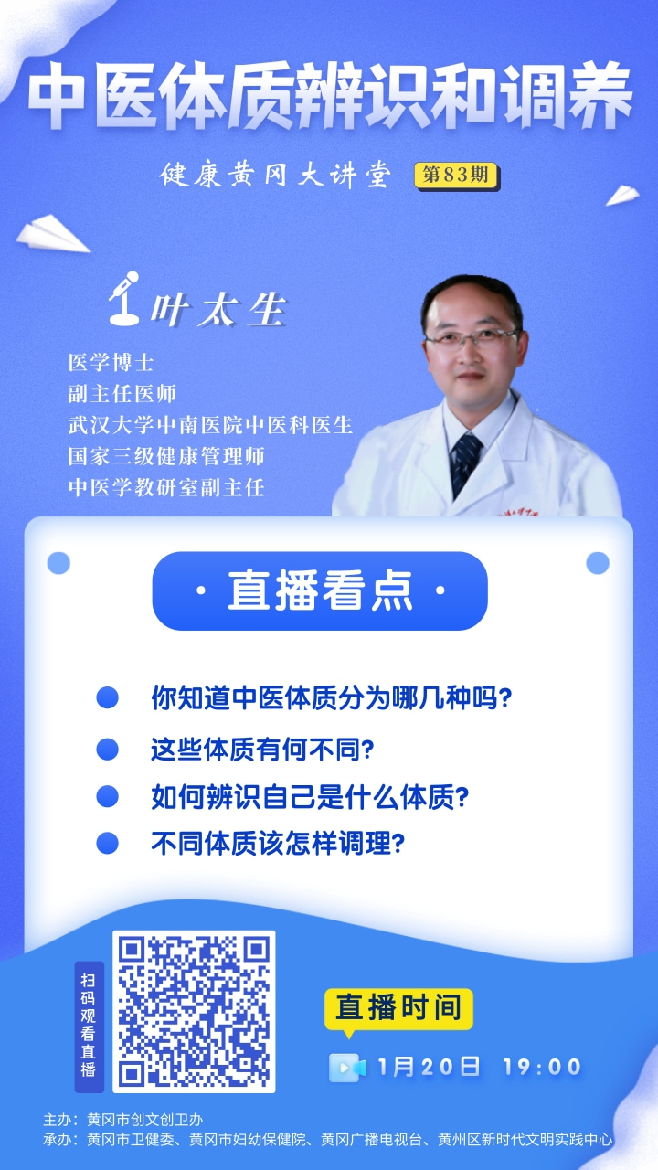 医学博士,副主任医师武汉大学中南医院中医科医生国家三级健康管理师中医学教研室副主任叶太生将在《健康黄冈大讲堂》的节目直播间为您解疑答惑, 敬请广大市民届时收看收听!还可在直播间向专家提问,专家将现场为您解答!扫描下方图片二维码,进入直播间,即可观看精彩节目!