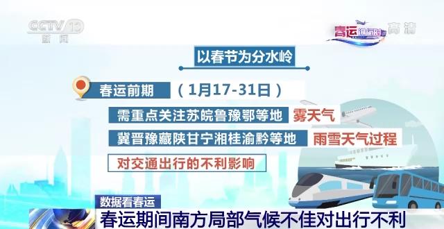 以春节为分水岭。春运前期(1月17日-31日),需重点关注苏皖鲁豫鄂等地雾天气、冀晋豫藏陕甘宁湘桂渝黔等地雨雪天气过程对交通出行的不利影响。