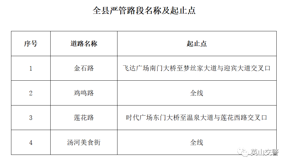 一、金石路、鸡鸣路、莲花路、汤河美食街4条道路为机动车违法停车行为严格管理路段(简称“严管路段”),除依法施划的停车泊位外,全天禁止机动车停放或临时停车。