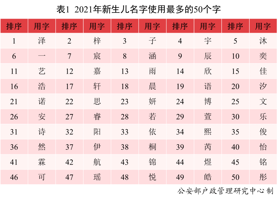 2021年新生儿名字使用最多的50个字