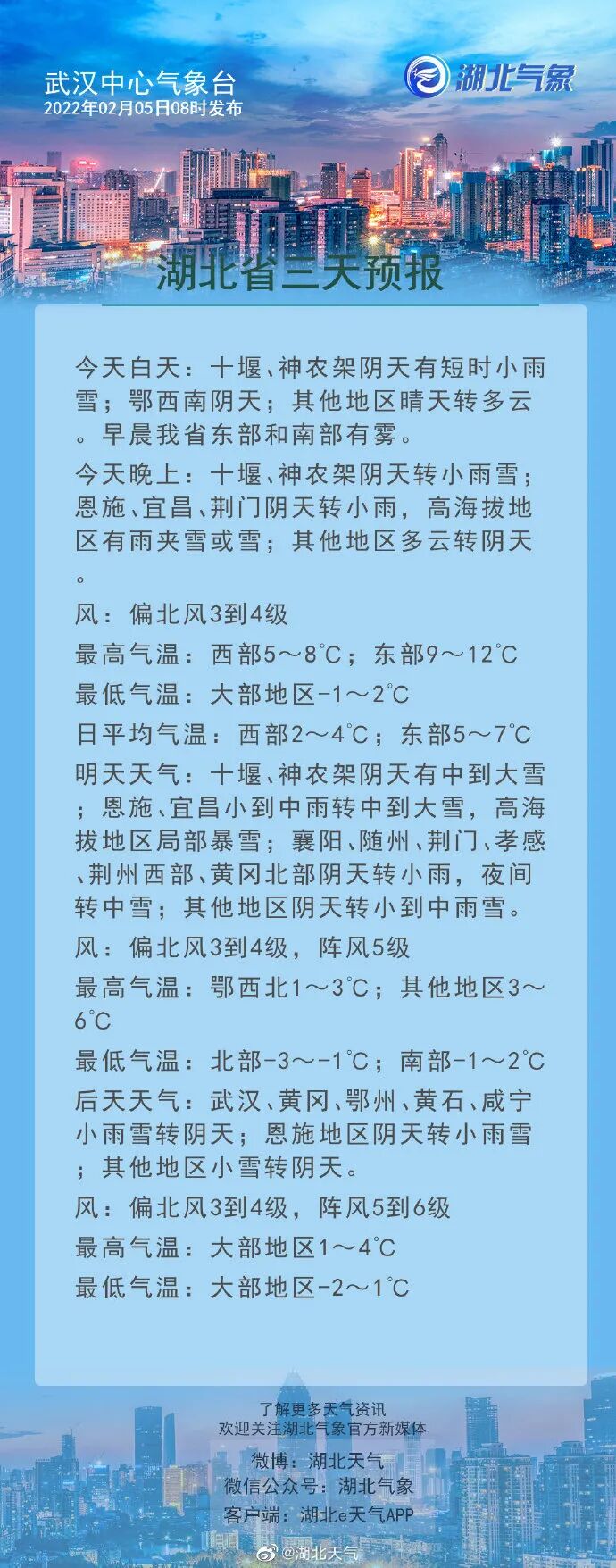 预计今天(5号),雨雪天气集中在十堰、神农架、宜昌、恩施以及高海拔地区,明天雨雪范围扩大至全省,其中十堰、神农架阴天有中到大雪,高海拔地区局部有暴雪。