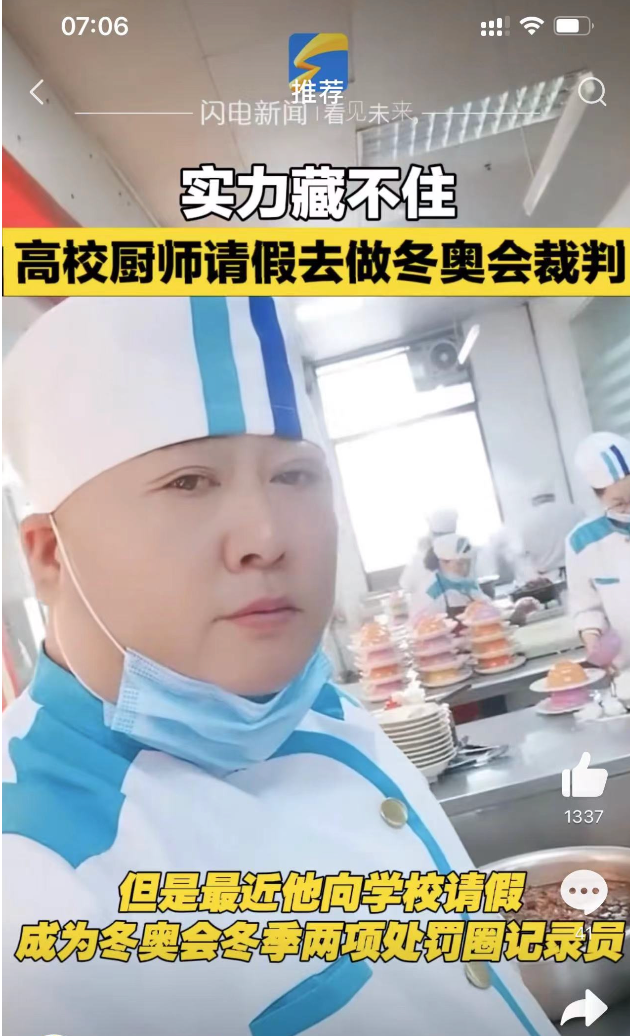隐藏身份曝光 高校厨师请假去当冬奥会裁判