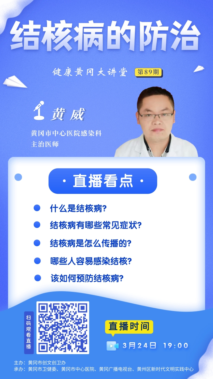 3月24日(今天)19:00黄冈市中心医院感染科主治医师黄 威将在《健康黄冈大讲堂》的节目直播间为您解疑答惑, 敬请广大市民届时收看收听!还可在直播间向专家提问,专家将现场为您解答!扫描下方图片二维码,进入直播间,即可观看精彩节目!