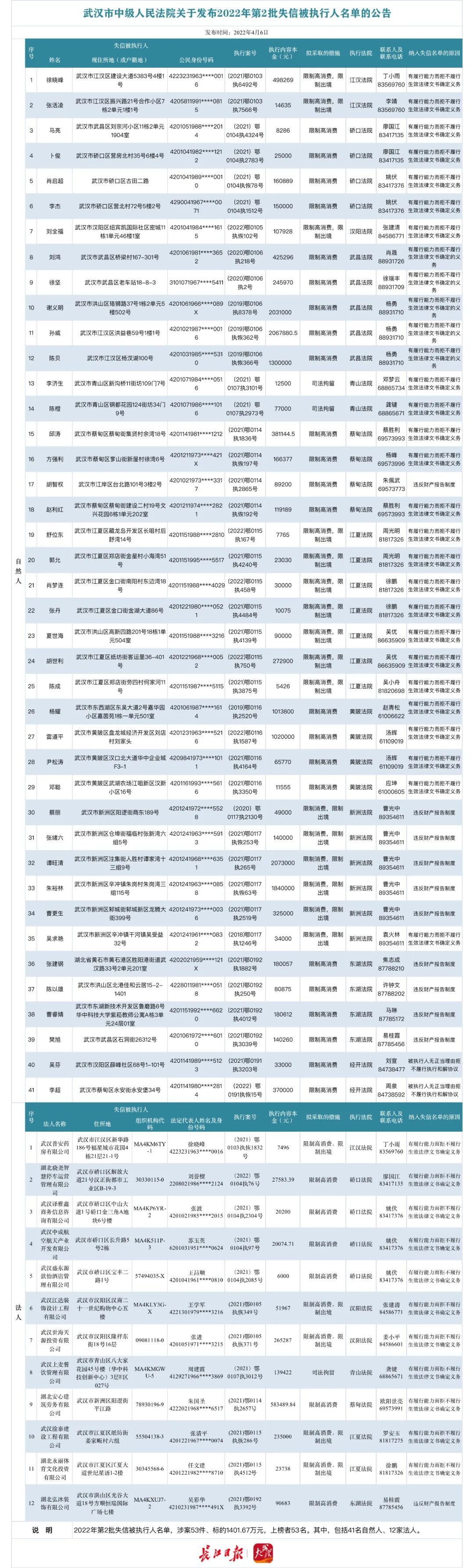 需要特别说明的是,人民法院定期在媒体曝光的失信名单只是失信被执行人名单库的一部分,更多实时失信信息请登录中国执行信息公开网查询,“中国执行”“武汉市中级人民法院”微信公众号“司法公开”栏均可点击进入。