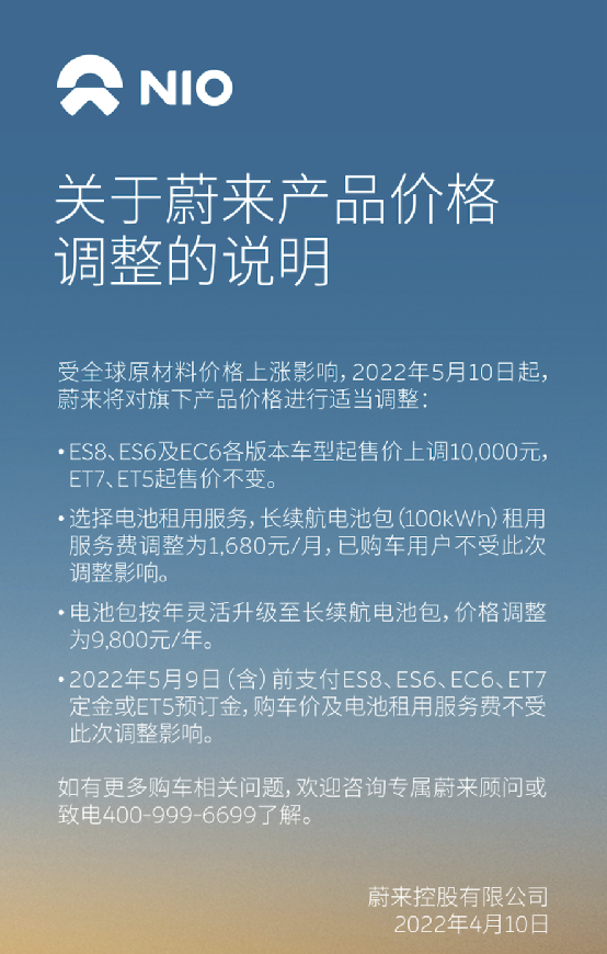 4月10日,蔚来发布产品价格调整的通知,受今年以来全球原材料价格持续大幅上涨的影响,2022年5月10日起,蔚来将对旗下产品价格进行适当调整。