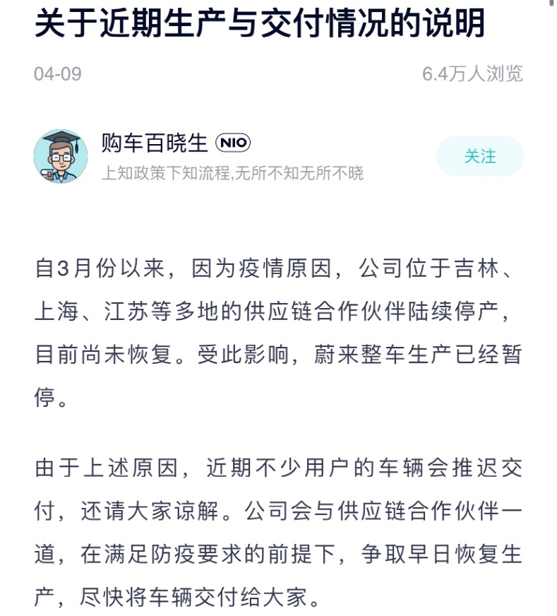蔚来汽车4月9日在其官方APP上表示,自3月份以来,因为疫情原因,公司位于吉林、上海、江苏等多地的供应链合作伙伴陆续停产,目前尚未恢复。受此影响,蔚来整车生产已经暂停。由于上述原因,近期不少用户的车辆会推迟交付。