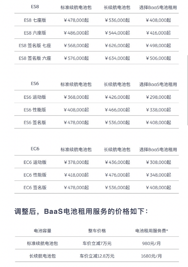 BaaS电池租用价格方面,长续航电池包电池租用服务费由1480元/月调整为1680元/月;标准续航电池包电池租用服务费不变,仍为980元/月。已购车用户不受该调整影响。