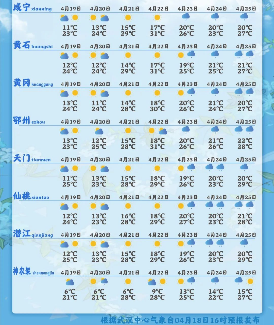全省多云到晴天,鄂西北、鄂西南、江汉平原北部局部有阵雨。
