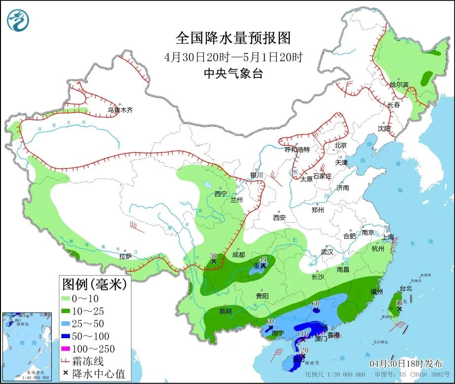 中央气象台预计,4月30日20时至5月1日20时,青海东部、甘肃西南部、西藏南部等地的部分地区有小到中雪或雨夹雪,局地大雪;川西高原南部、四川南部、重庆南部、云南北部和南部、湖南南部、江西南部、福建、广西、广东、海南岛、台湾岛等地的部分地区有中到大雨。