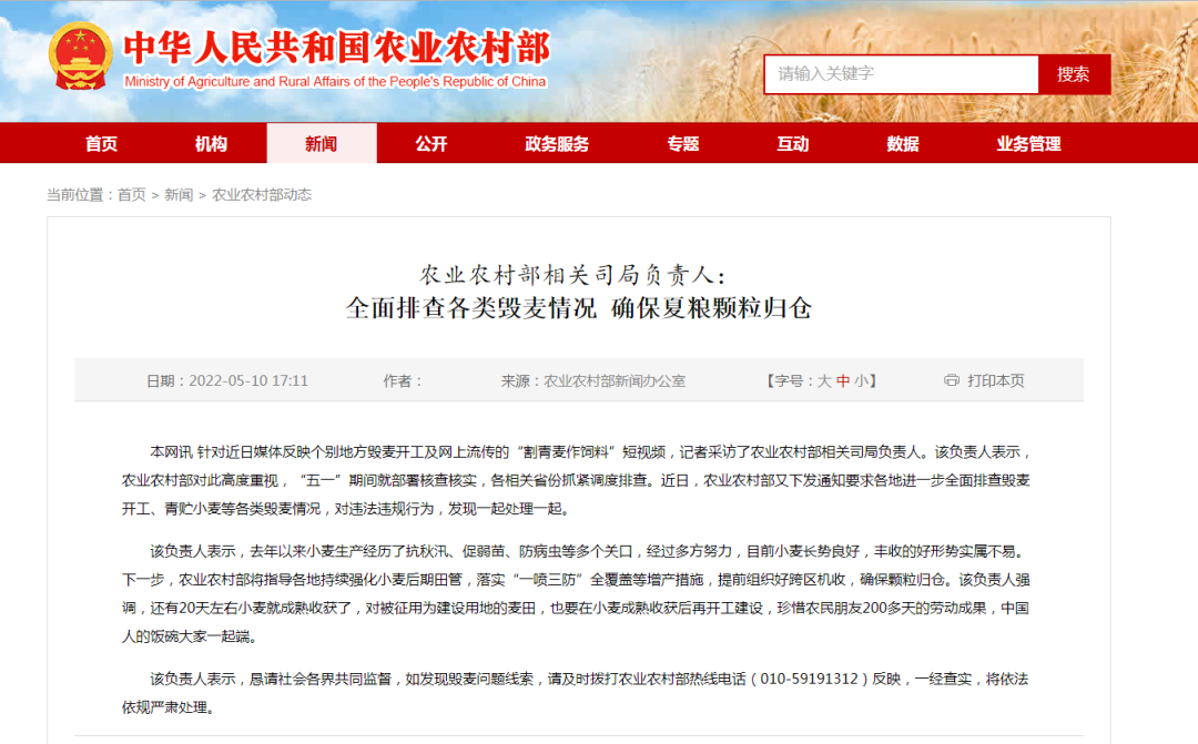 该负责人表示,恳请社会各界共同监督,如发现毁麦问题线索,请及时拨打农业农村部热线电话(010-59191312)反映,一经查实,将依法依规严肃处理。