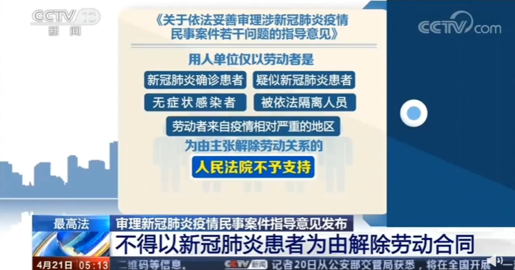 据央视消息,2020年4月,最高人民法院就在指导意见中明确,不得以新冠肺炎为由解除劳动合同。意见指出,用人单位仅以劳动者是新冠肺炎确诊患者、疑似新冠肺炎患者、无症状感染者、被依法隔离人员,或者劳动者来自疫情相对严重的地区为由主张解除劳动关系的,人民法院不予支持。
