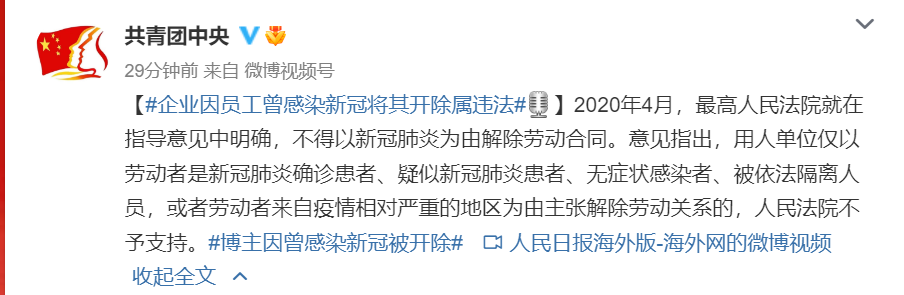 5月29日,博主“我是小妖怪的人”发文称,因自己曾感染新冠病毒,失去了第一份工作。