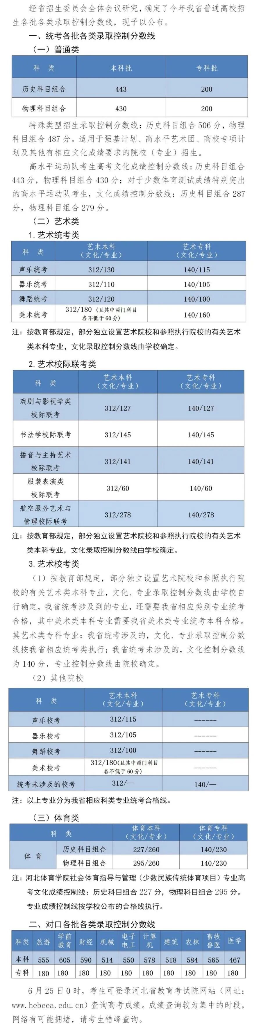 1.录取控制分数线是指高考总分应达到的最低分数要求,高考总分是指考生普通高校招生全国统一考试成绩总分与在全国范围适用的政策性照顾加分分值之和。2.报考体育类考生高考总分须达到体育类录取控制分数线,且体育专业术科测试成绩合格。其中,本科体育专业术科测试合格线文史类为67分,理工类为63分;高职(专科)体育专业术科测试合格线为60分。