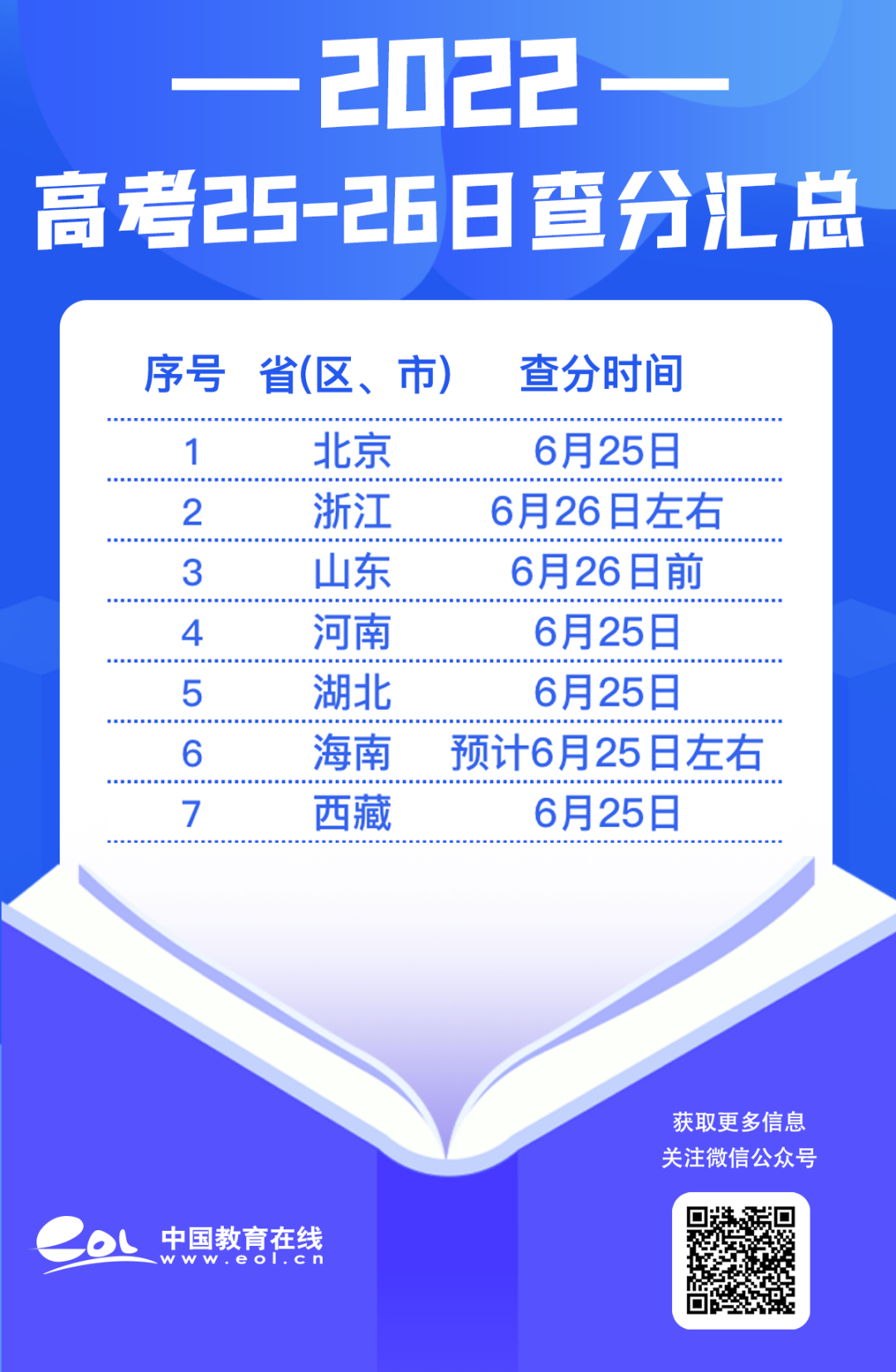以下省(市、自治区)将于未来两天公布高考成绩及分数线,请各位考生、家长持续关注,中国教育在线将第一时间发布相关信息。