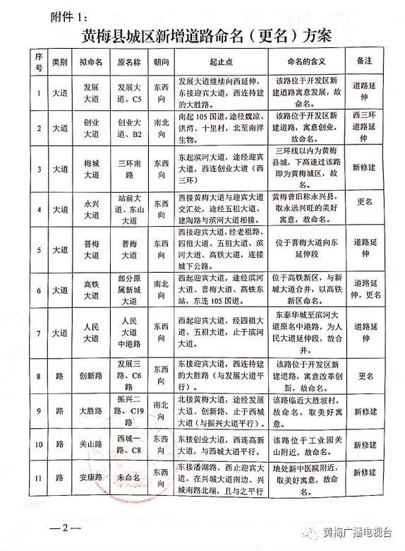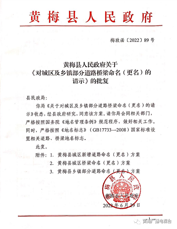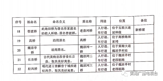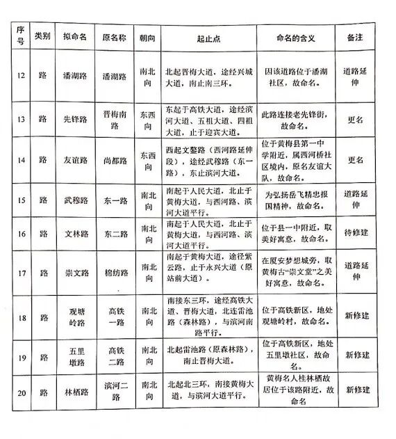 道路桥梁名称是一座城市独特的文化符号,积淀着历史、风俗和文化,体现着时代精神和城市品位,更寄托着广大市民对未来发展的期许。为方便居民日常生活,发挥黄梅城区新建道路、桥梁作用,日前,黄梅县政府批复了县民政部门提出的“城区及乡镇部分道路桥梁命名(更名)意见”,正式确定了县城区7条大道、13条路(含道路延伸)、22座桥梁以及部分乡镇道路的规范地名。