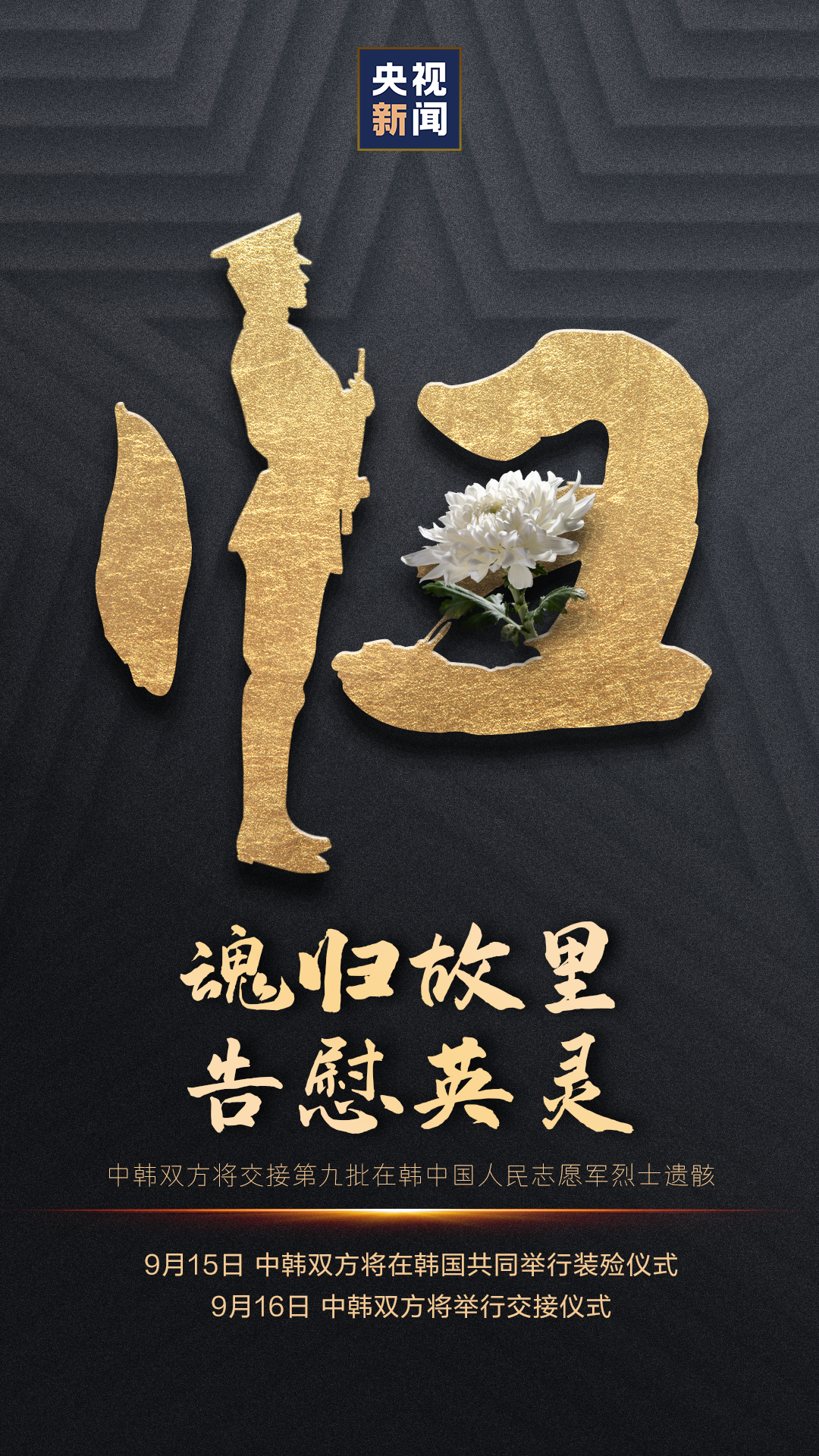 中韩双方达成共识,将于今年9月15日在韩国共同举行装殓仪式,9月16日举行交接仪式,韩方向中方移交第九批在韩中国人民志愿军烈士遗骸及遗物。