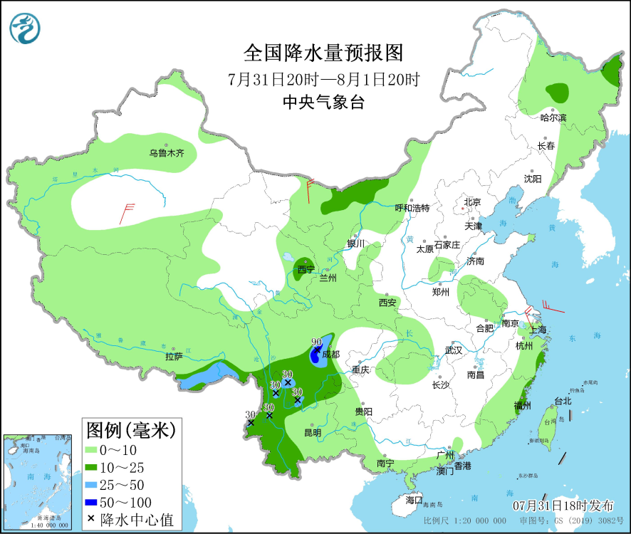 中央气象台预计,7月31日20时至8月1日20时,内蒙古西北部、黑龙江东北部、四川盆地西南部、云南西部和北部等地部分地区有中到大雨,其中,四川盆地西南部等地局地有暴雨。