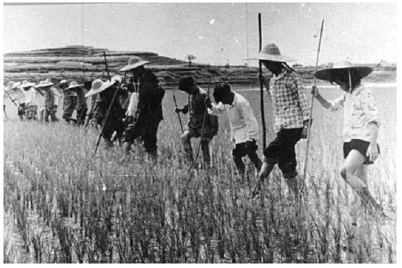 蕲春二里湖农业高中师生在稻田薅草