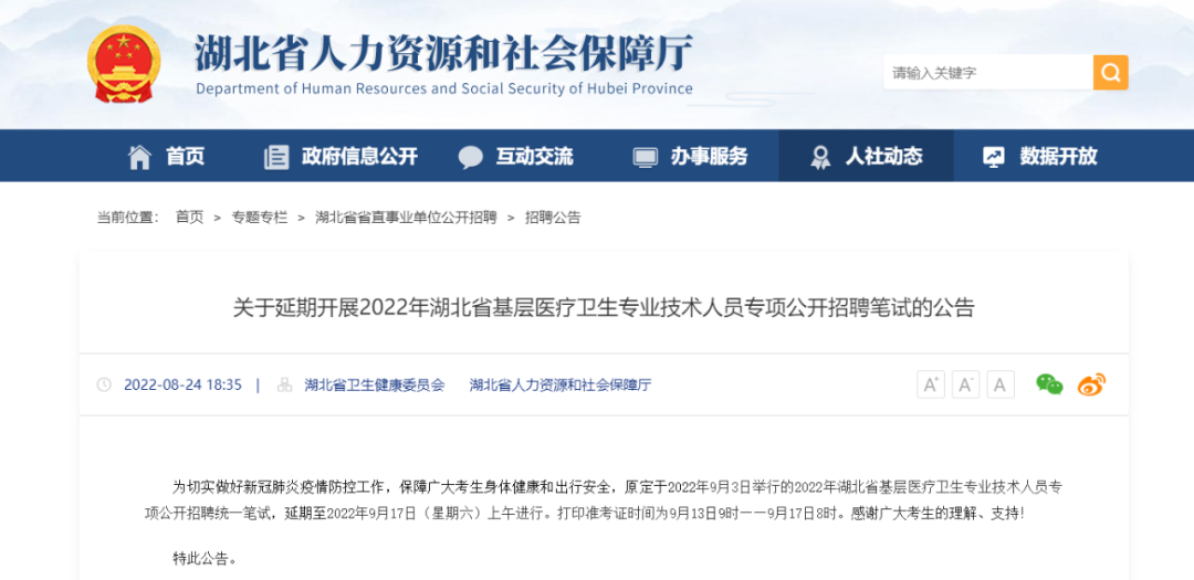 为切实做好新冠肺炎疫情防控工作,保障广大考生身体健康和出行安全,原定于2022年9月3日举行的2022年湖北省基层医疗卫生专业技术人员专项公开招聘统一笔试,延期至2022年9月17日(星期六)上午进行。打印准考证时间为9月13日9时——9月17日8时。感谢广大考生的理解、支持!