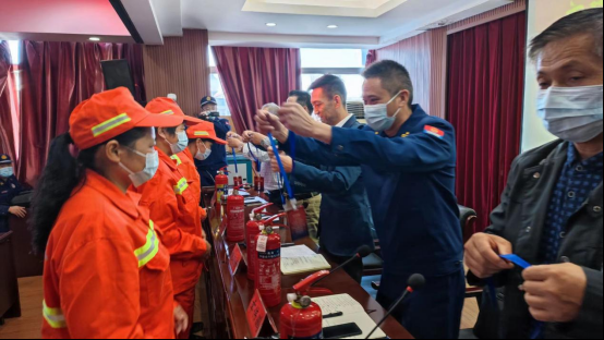 仪式上,章伟鹏为环卫消防志愿服务队授予了队旗,为一线职工代表佩戴了消防志愿者胸牌、发放了随车灭火器,并向现场消防志愿者作了动员讲话,感谢他们日常工作中的辛勤付出,希望每一名志愿服务队成员要当好“隐患搜集员”、“消防宣传员”、“火灾监控员”、“平安守护员”,为全市消防工作贡献自身力量。随后,支队宣传员组织参会人员注册了全民消防学习平台,观看了消防安全警示教育片,培训了干粉灭火器的使用方法,并将印有消防安全常识的宣传海报张贴在各自保洁作业车的显著位置。