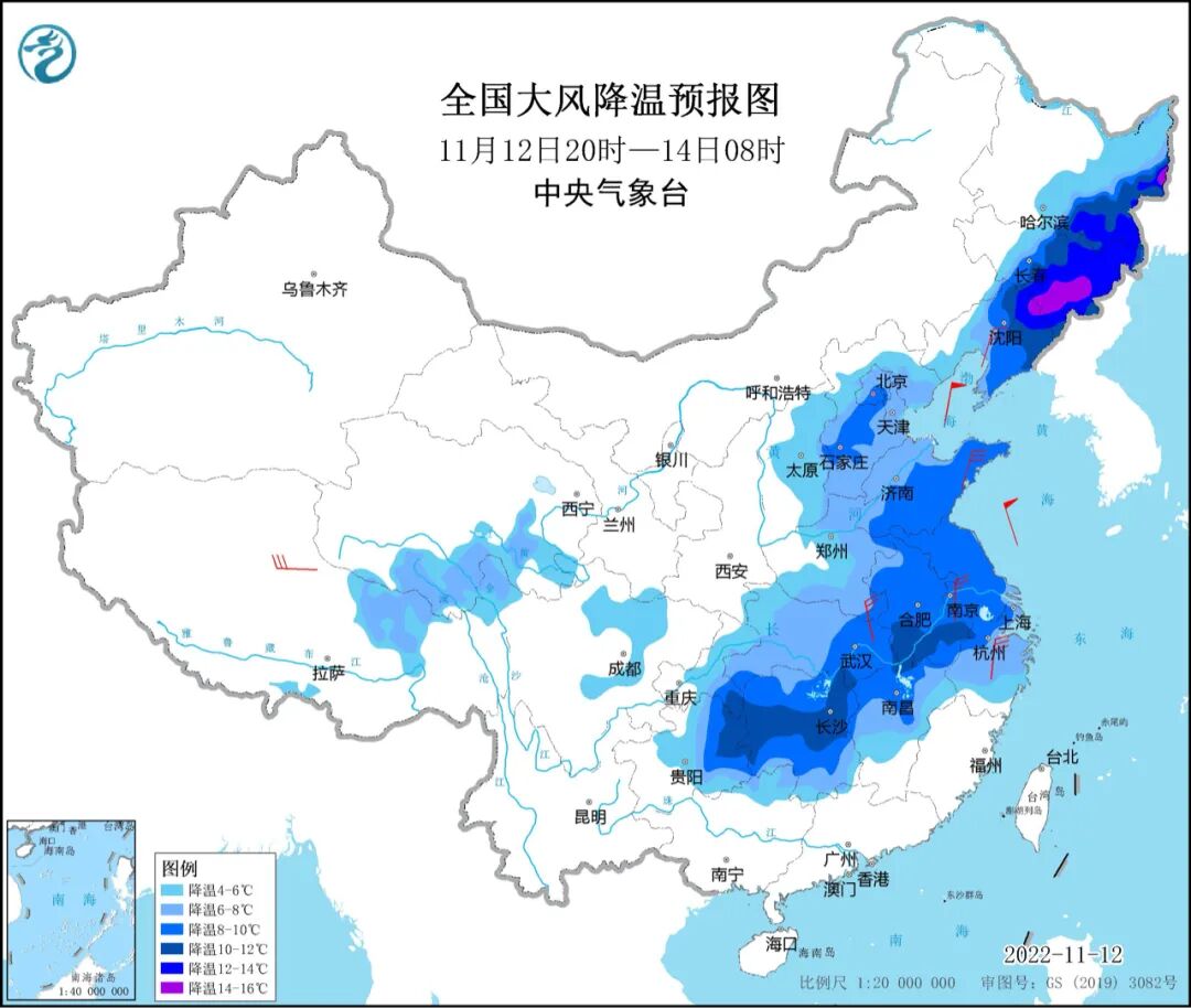中央气象台12日18时继续发布大风降温预报,预计12日20时至14日8时,东北地区东部和南部、华北、黄淮、江淮、江汉、西南地区东部、江南大部等地气温将下降4~8℃,其中,黑龙江东南部、吉林东部、辽宁东北部以及江南北部和西部等地降温幅度达10~12℃,局地14℃以上。