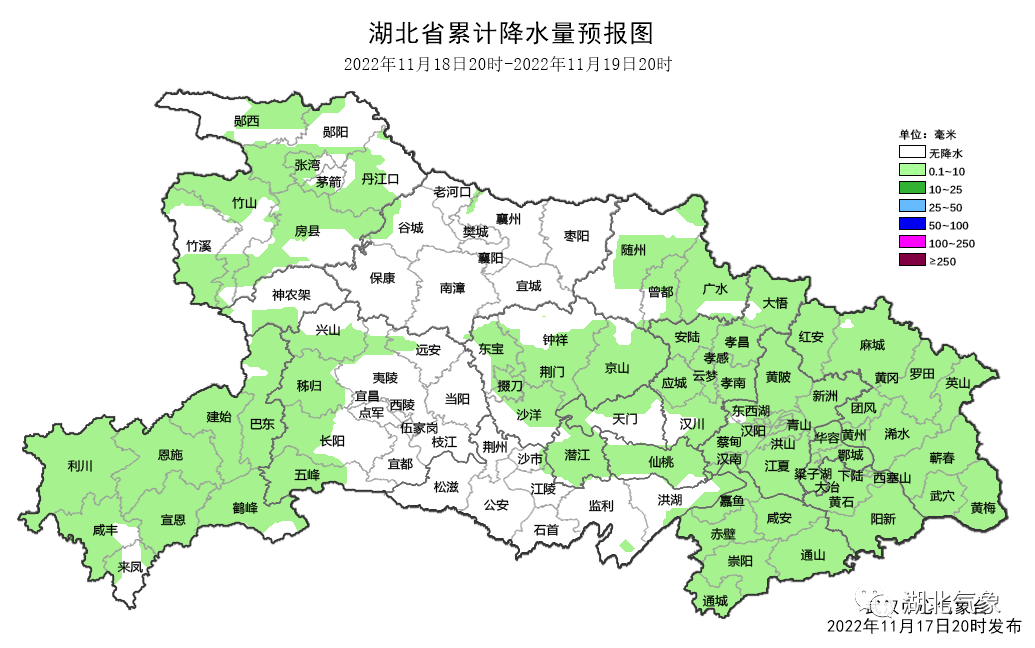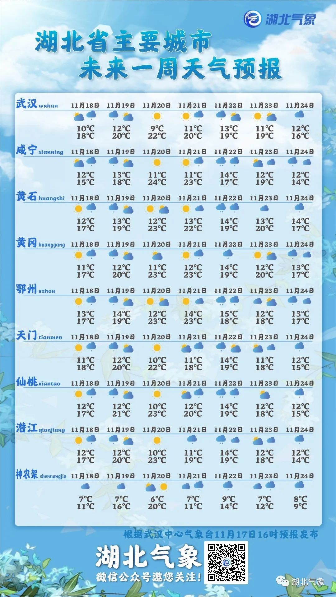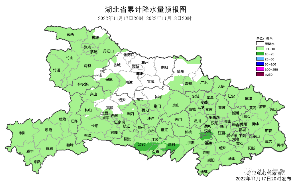 鄂西南、江汉平原南部、鄂东南阴天,局部有短时小雨;其他地区多云