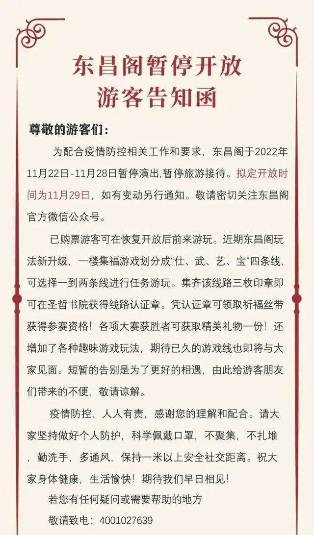 11月22日-11月28日期间,黄石东昌阁暂停演出、暂停旅游接待,已购票游客可在恢复开放后前来游玩。