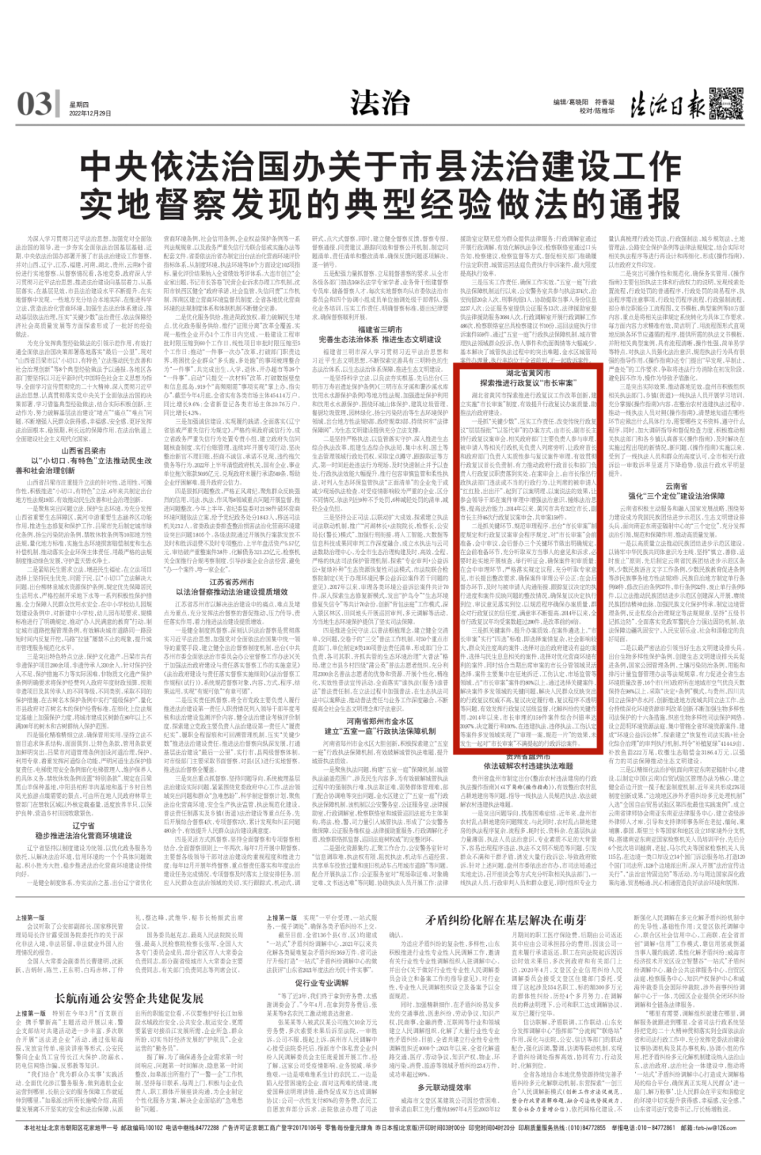 从督察情况看,各地党委、政府深入学习贯彻习近平法治思想,推进法治建设向基层着力、从基层落实、在基层见效,市县法治建设水平不断提升。在实地督察中发现,一些地方充分结合本地实际,在推进科学立法、营造法治化营商环境、加强生态法治体系建设、推动基层依法治理、压实“关键少数”法治责任、依法保障经济社会高质量发展等方面探索形成了一批好的经验做法。