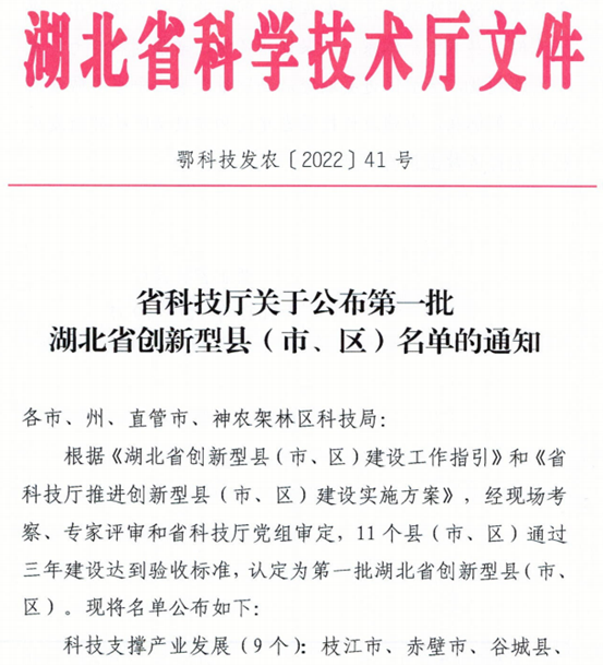 湖北省科技厅公布了第一批湖北省创新型县(市、区)名单,武穴市、麻城市成功入选。