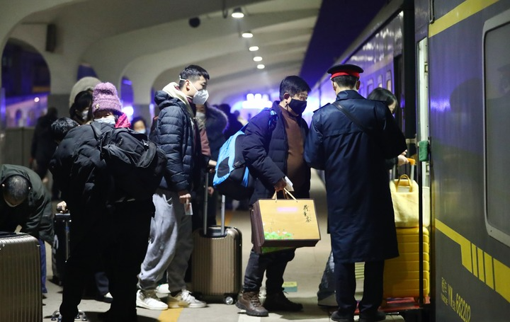 1月7日凌晨,在山东省滕州市火车站,旅客在站台乘车。新华社发(李志军 摄)