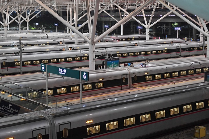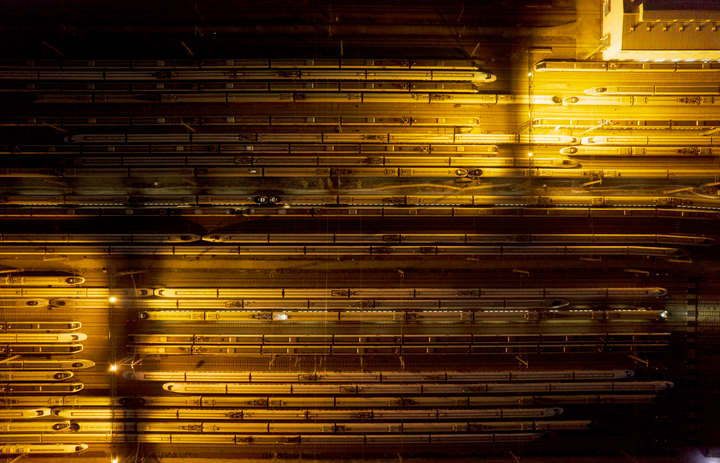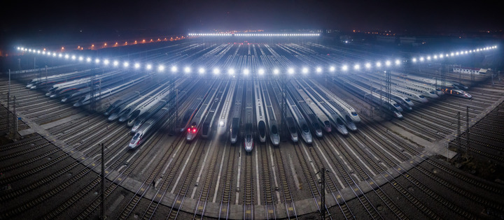 1月7日凌晨,动车组列车停靠在武汉动车段的存车线上(无人机拼接照片)。新华社记者 伍志尊 摄