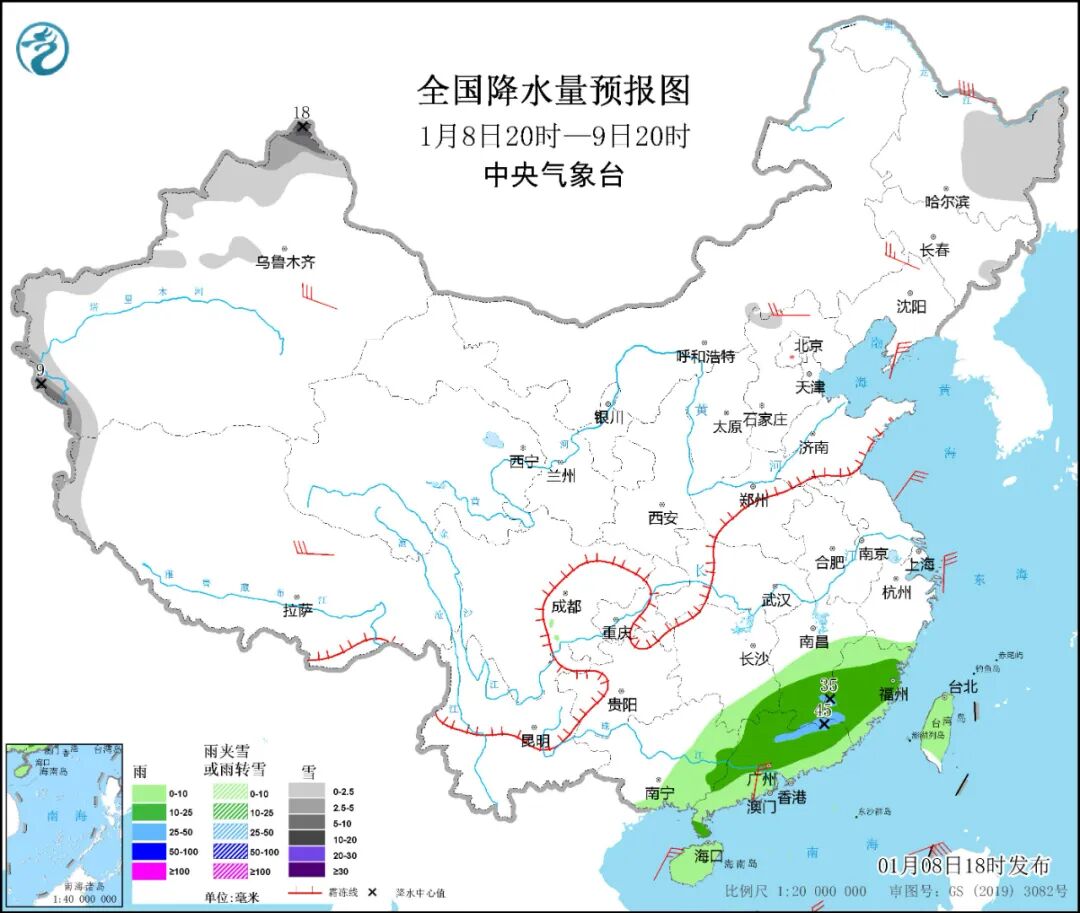 中央气象台预计,8日夜间至10日,新疆北部和南疆西部山区有持续性降雪,大部地区有小到中雪,塔城、阿勒泰、南疆西部山区等地部分地区有大雪,局地暴雪;海南岛、广东大部、江西南部、福建中南部等地的部分地区将有中到大雨。
