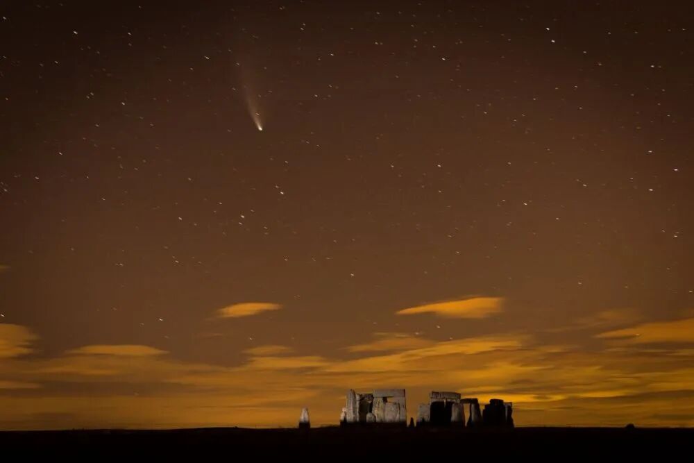 2020年7月23日,在英国英格兰威尔特郡的巨石阵,新智彗星划过天际。新华社发(蒂姆·爱尔兰摄)