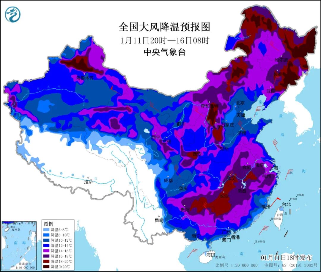 中央气象台11日18时继续发布寒潮蓝色预警,预计11日20时至16日8时,寒潮天气将自西向东影响我国大部地区。我国大部地区气温将先后下降8~12℃,其中,新疆北部、内蒙古中东部、黑龙江北部和东部、吉林中东部、辽宁东北部等地的部分地区降温超过20℃。