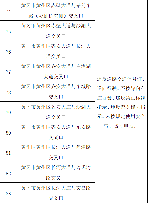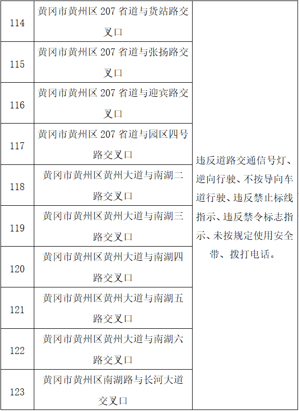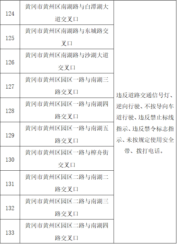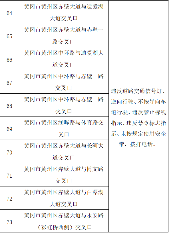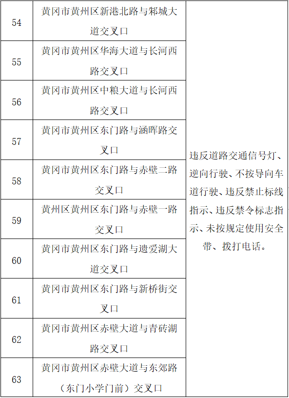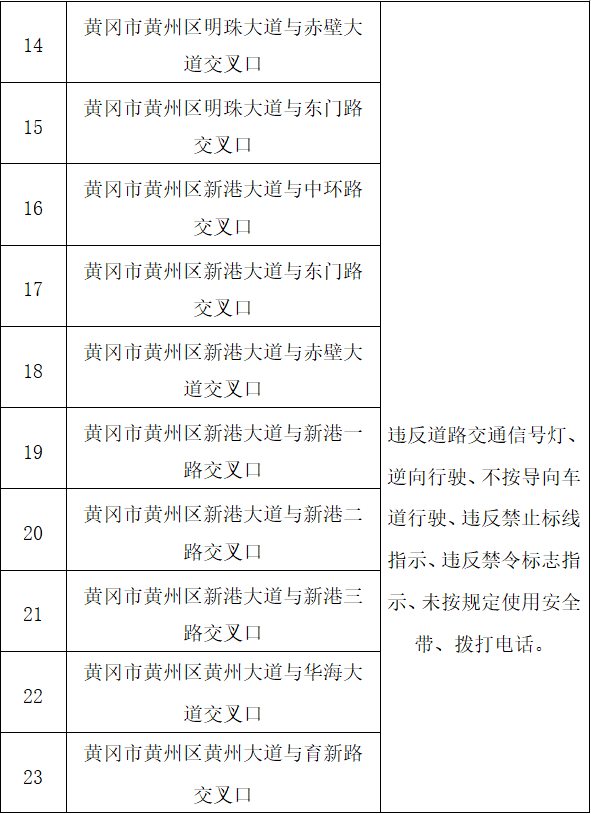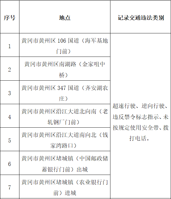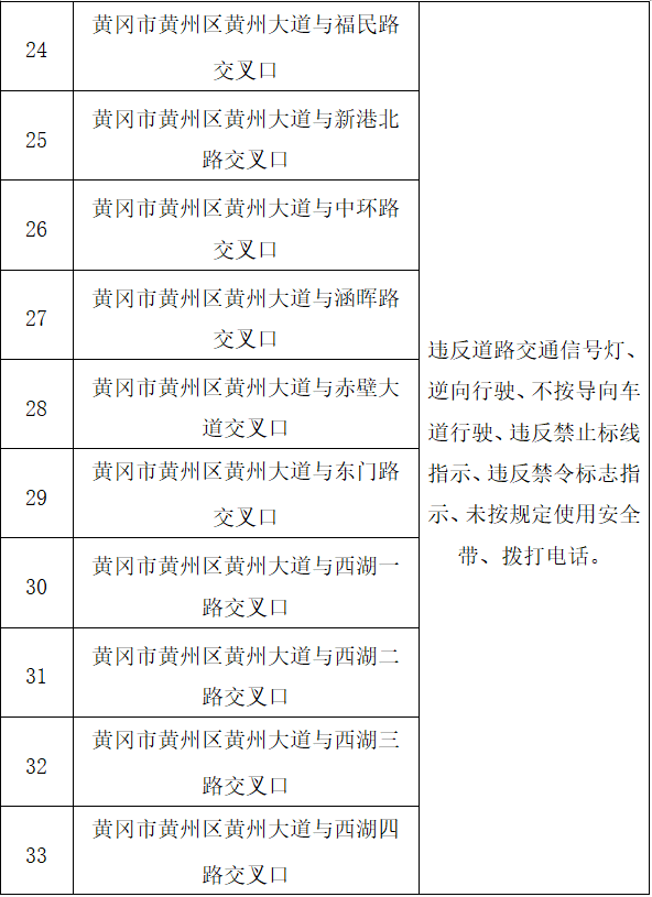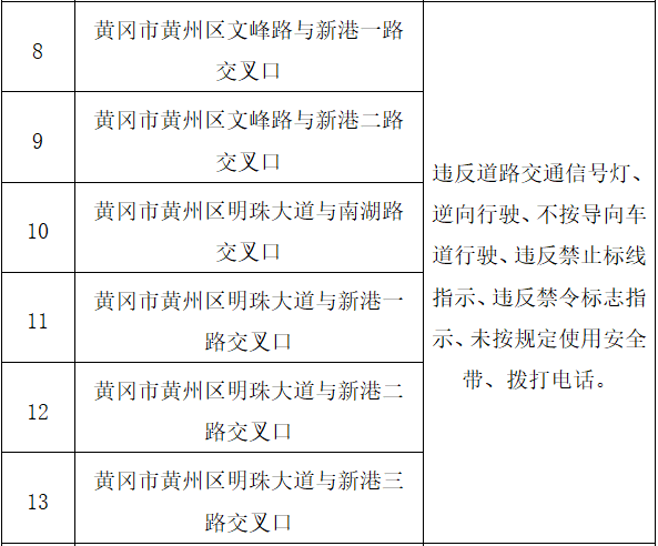 为改善黄冈市区道路交通秩序,减少道路交通拥堵,营造安全、有序的道路通行环境,黄冈市公安局交通警察支队在市区启用了交通技术监控设备,针对驾驶人驾驶机动车违反道路交通信号灯通行、违反禁止标线指示、逆向行驶、不按导向车道行驶、信号灯路口越线停车、违反禁令标志、未按规定使用安全带、拨打电话、违法停车、人行道不停车让行、超速行驶等交通违法行为实施定点抓拍并依法处罚。按照《行政处罚法》《道路交通安全法》等法律法规有关要求,现将相关设置地点重新向社会公布,请广大交通参与者自觉遵守道路交通安全法律法规。