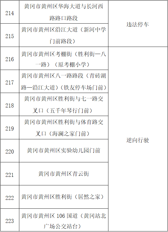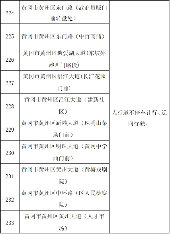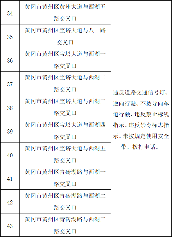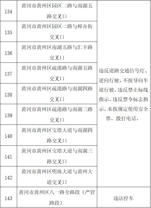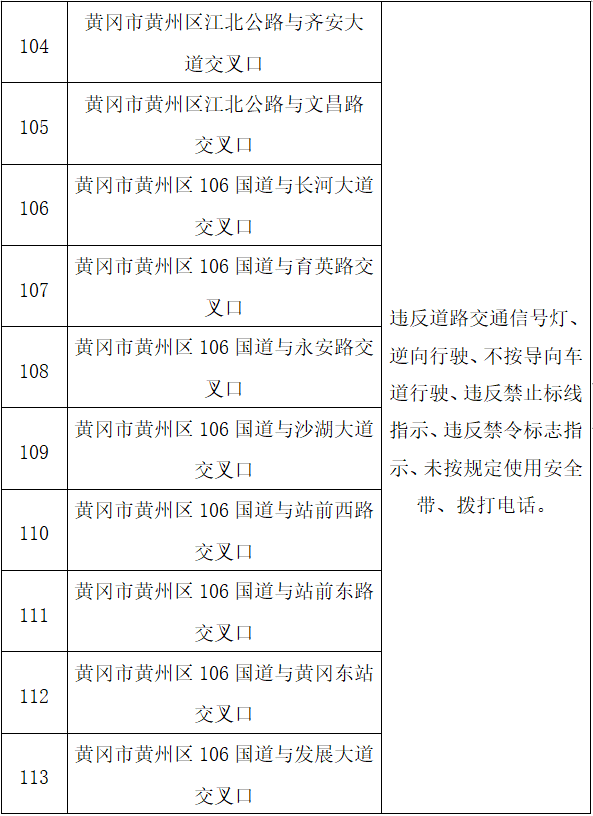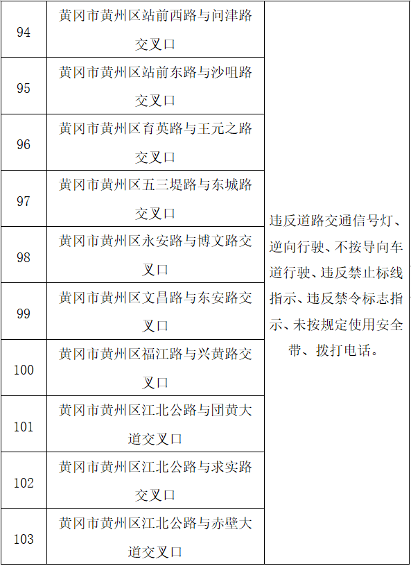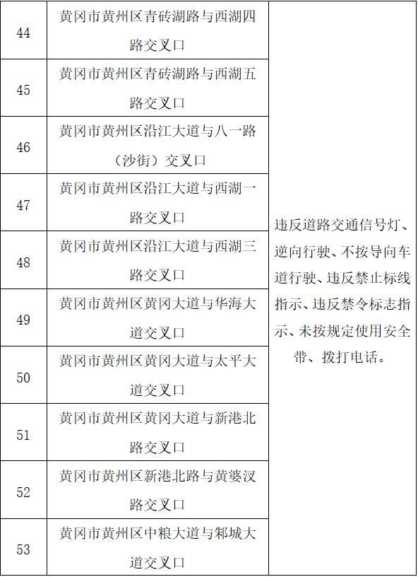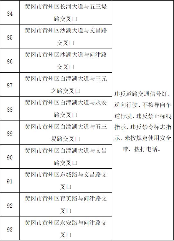 为改善黄冈市区道路交通秩序,减少道路交通拥堵,营造安全、有序的道路通行环境,黄冈市公安局交通警察支队在市区启用了交通技术监控设备,针对驾驶人驾驶机动车违反道路交通信号灯通行、违反禁止标线指示、逆向行驶、不按导向车道行驶、信号灯路口越线停车、违反禁令标志、未按规定使用安全带、拨打电话、违法停车、人行道不停车让行、超速行驶等交通违法行为实施定点抓拍并依法处罚。按照《行政处罚法》《道路交通安全法》等法律法规有关要求,现将相关设置地点重新向社会公布,请广大交通参与者自觉遵守道路交通安全法律法规。