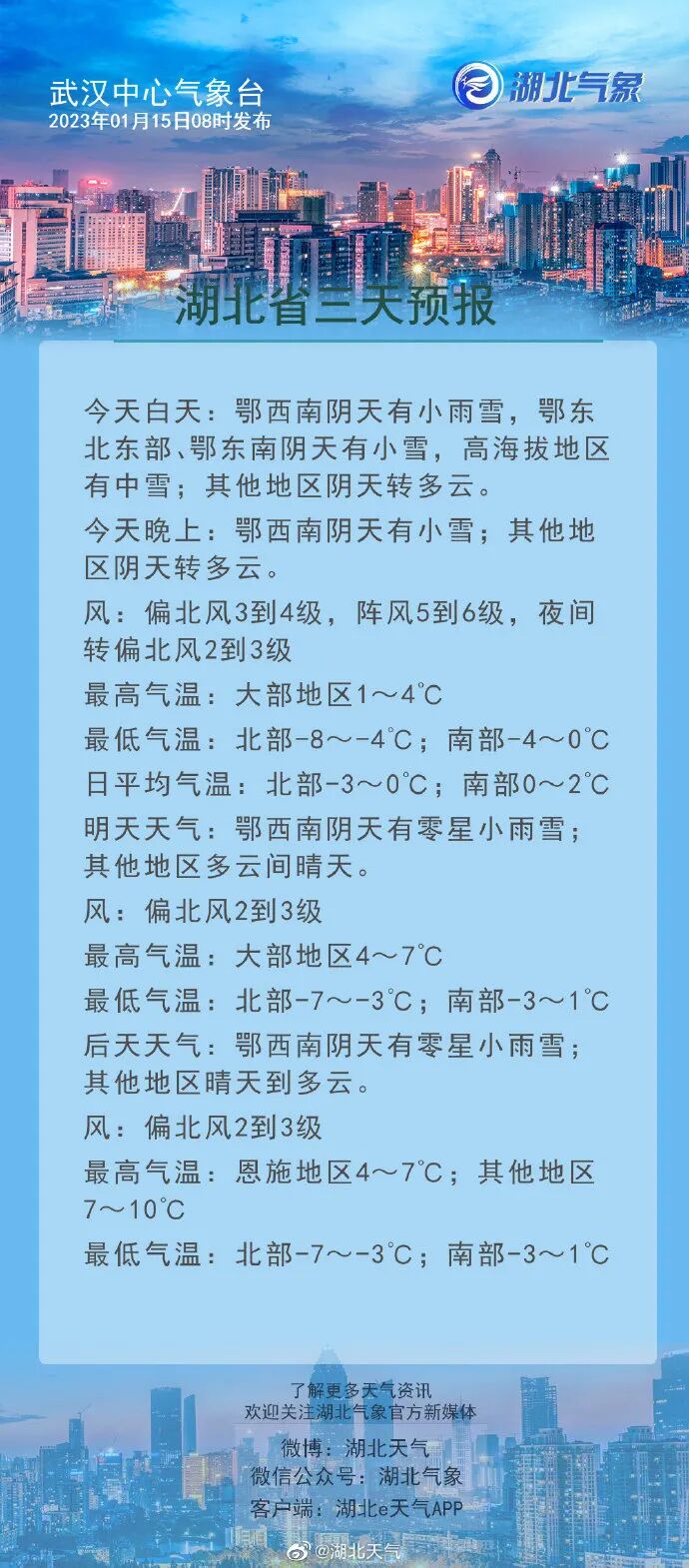 今天(1月15日)雪势减弱:除鄂东和鄂西南有小雪、高海拔地区有中雪外,湖北其他地区阴天转多云;不过偏北风仍有6-8级,气温低,最低气温鄂北-4至-2°C、鄂南-2至1°C。