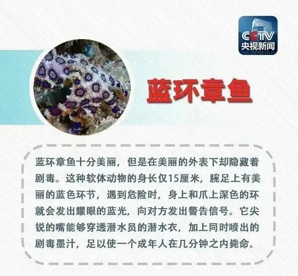 别看蓝环章鱼长得别致,但据说一只蓝环章鱼的毒就可以杀死26个成年人,而且起效十分迅速。