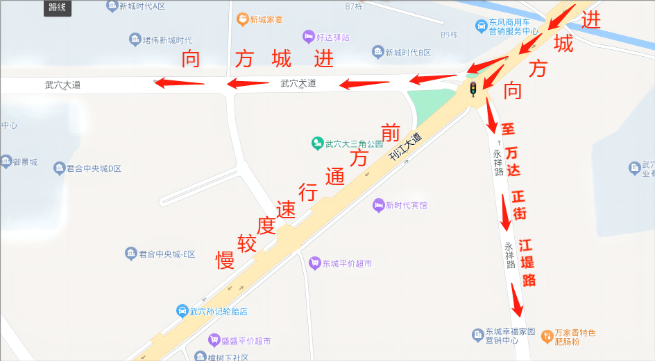 2、进城方向车辆可在武穴大道与刊江大道交叉口处根据目的地由武穴大道、永祥路分流行驶。