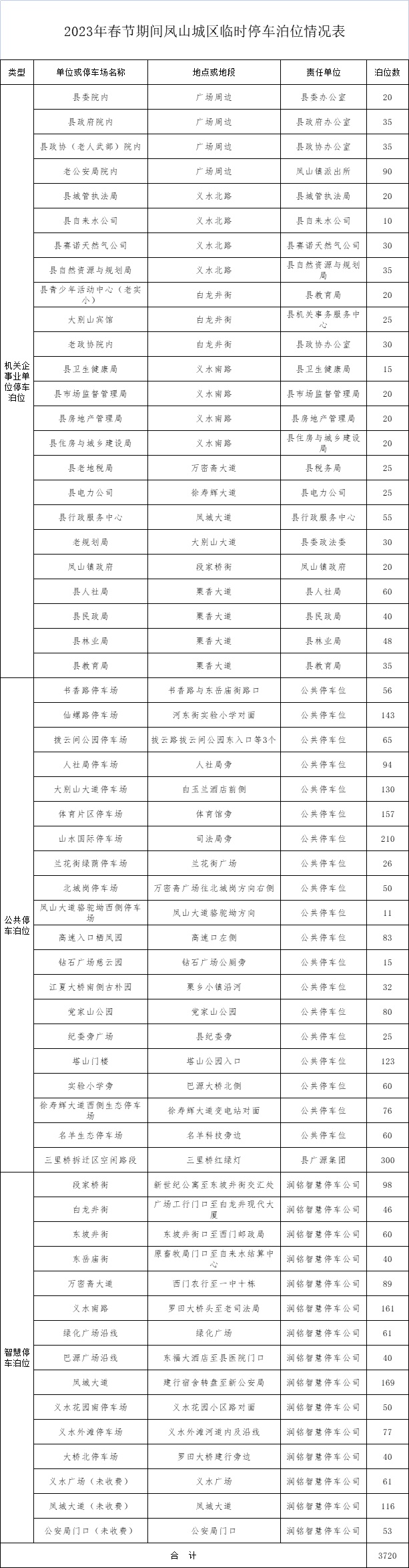 为满足春节期间广大群众临时停车需求,保障道路交通有序、安全和畅通,特向公众提供一批临时停车泊位(共计3720个)。现将有关事项通知如下: